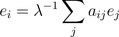 . In the equation, the prestige of node i, ei, is based upon the prestige of all nodes to which it attaches, ej. Thus, in this case, the importance of a node is a function of the importance of the nodes to which the original node is connected.