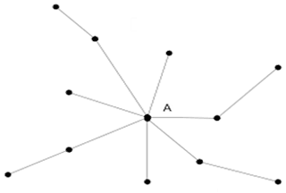 , where ni is the given node, and dij is the distance to another node. One can compare these numbers across nodes to evaluate position relative to other individuals in the network. Proximity prestige is particularly informative in star-like networks. As you can see in Figure 1, node A will register as being the most central node and the nodes that radiate out from node A will be less central as each connection increases the distance from the center.