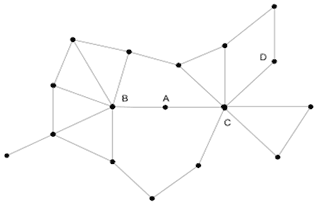 Prestige centrality accounts for the position of nodes to which an original node is attached. It also accounts for the weights on the arcs and edges of a network. In many cases, it is not just important what connections a node has, but it is also important what connections the nodes that it is connected to have. In Figure 2, when determining whether node A is more or less important than node D, it is evident that both nodes have two connections. However, it is node A that has the position of greater structural importance because it is connected to nodes B and C, the two most connected nodes in the network.
